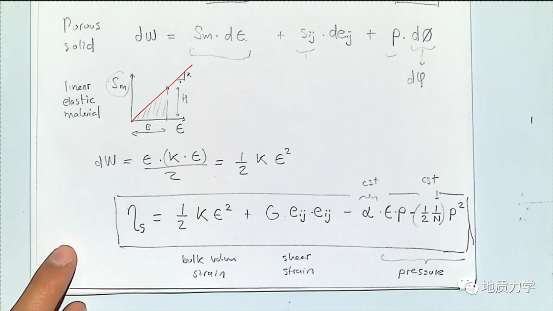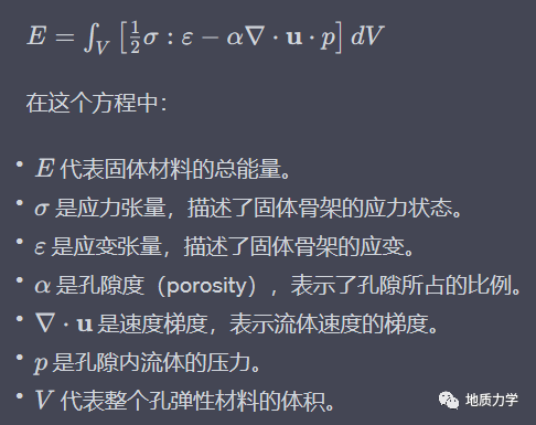 这个能量方程考虑了固体骨架的弹性能量以及孔隙内流体的渗流能量。方程中的各项表示了不同能量贡献的总和。孔弹性材料的行为是固体骨架的机械行为和孔隙内流体的渗流行为之间相互耦合的结果。