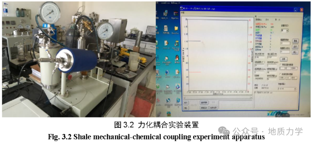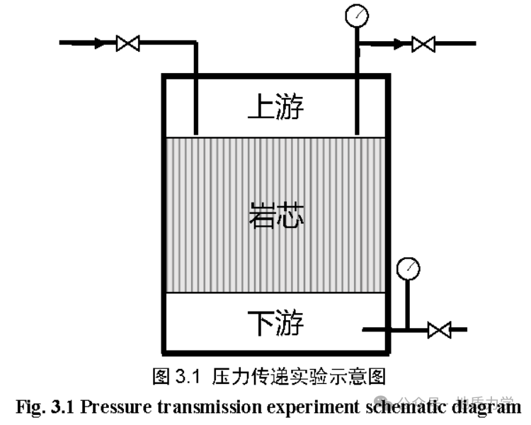图 3.1 为页岩压力传递实验示意图,将切割打磨平整的岩芯柱套上不具有渗透性的胶套之后置于岩芯腔中,岩芯腔上游连接压力泵和液罐后可进行循环流动,来模拟钻井液的循环过程,同时上游的压力可通过伺服装置进行人为的控制,岩芯腔下游连接压力表以测定液体压力,压力传递设备与电脑相连,上、下游压力数据可实时的显示在电脑屏幕上。实验所用设备与数据输出如图3.2 所示。