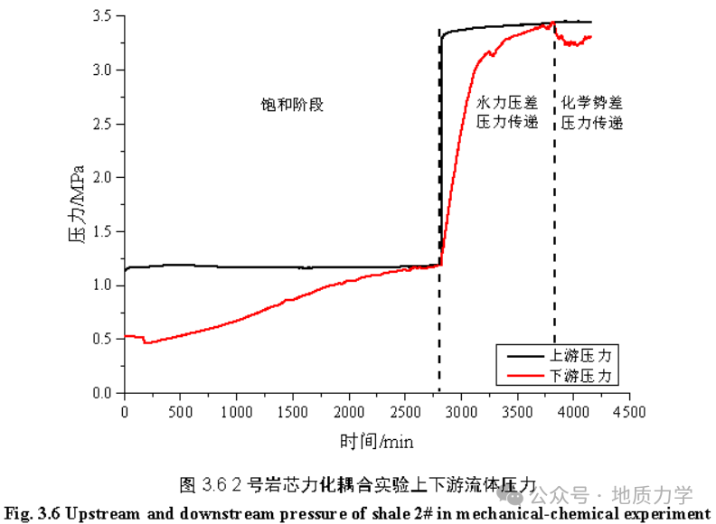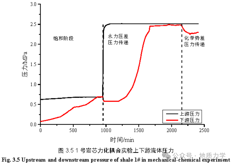 分别对 1 号和2 号岩芯按照实验步骤进行饱和操作、水力压差压力传递和化学势差压力传递,导出实验数据绘制实验曲线,结果如图3.5 和图3.6 所示。