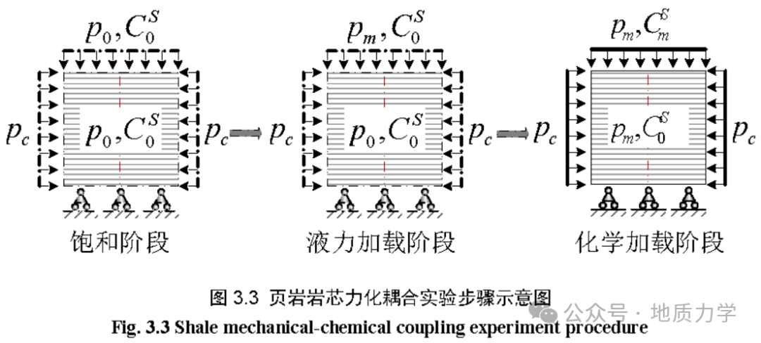 因此,页岩与钻井液的力化耦合作用过程分为三个阶段:岩芯饱和阶段,液力加载阶段,化学加载阶段。岩石内部与边界上的流体压力与溶质浓度分布可用图3.3 表示。