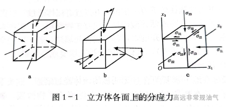 地下岩石受到的作用力可分解为三个互相垂直的分力,一个与面正交,两个与面平行,与面正交的分力称为正应力,与面平行的力称为剪应力(见下图)。