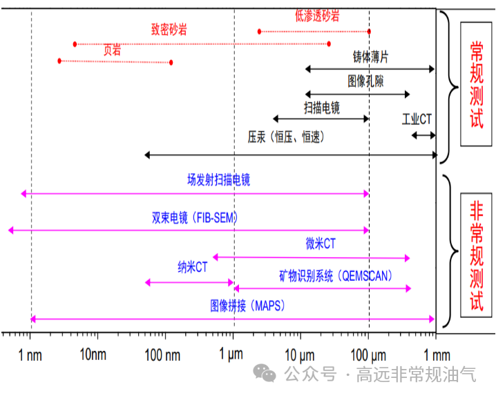 针对非常规储层孔喉细小,常规测试技术难以表征,要通过场发射扫描电镜、矿物识别及纳米CT等高分辨率测试技术对致密油、页岩油纳米级多尺度孔隙、喉道进行识别和表征。非常规储层孔隙分布及各类测试技术研究尺度范围如下图: