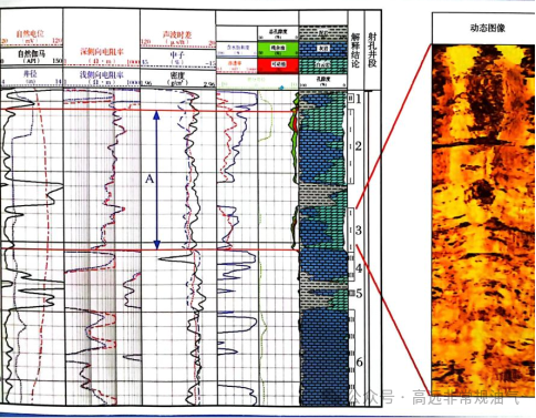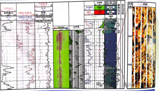 1、下图某井测井除常规项目外,还增测了声成像(CBIL)项目,该井风化壳顶部(A段)测井响应明显:自然伽马低值,显示为层状储层,有少量泥质夹层,中子、密度、声波三孔隙度曲线反应物性较好,交会计算孔隙度为5%-13%。双侧向电阻率侵入特征为小幅度低侵或无侵,数值变化较大,上部为100欧姆米左右,下部只有38欧姆米左右,说明储层物性较好。 2、CBIL图像显示溶孔、溶洞发育,伴有裂缝,钻井取芯及录井描述该段裂缝密度为30-50条/m,溶洞约为每米30个,直径为5-10mm。综合分析,该层段以次生孔隙为主的物性好、含油丰度高的储层,测井解释一类层2层,厚17米。
