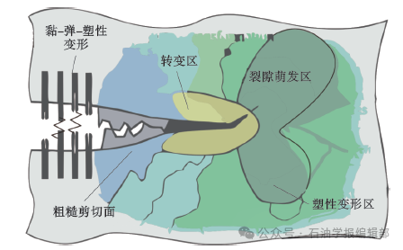 深层—超深层页岩在黏性、弹性、塑性 交互作用下,裂缝尖端钝化、扩展阻力增大,高温高压效应抑制天然裂缝(裂隙)开启扩展,难以发育复杂缝网。在高温和高应力环境下,深层—超深层页岩的非线性破裂机制及本构关系尚未构建,非线性破裂机制下的裂缝动态扩展机理不清[46](图5),裂缝扩展模型有待发展,裂缝扩展影响因素无法定量表征,耦合工程条件下的裂缝扩展规律不明。