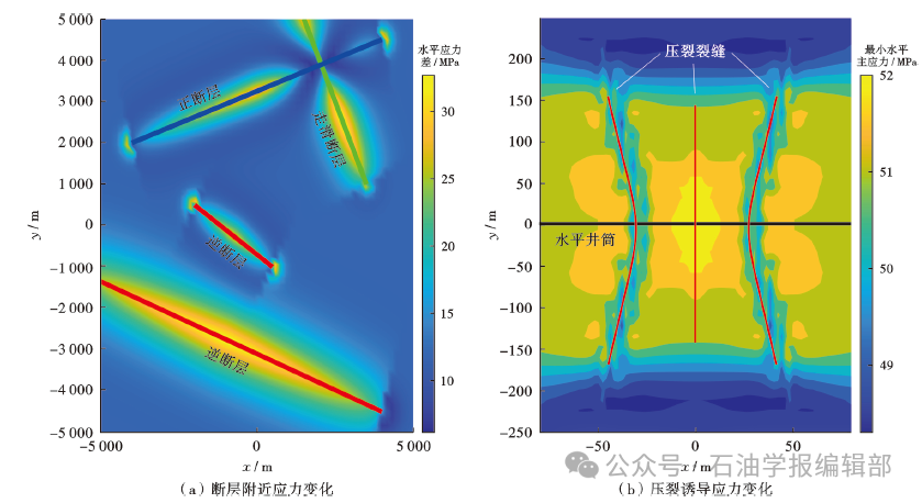 深层—超深层环境下复杂构造导致的复杂应力场以及钻井、压裂诱导应力场变化是井眼轨迹优化、复杂缝网设计、套变压窜防控的基础。深层—超深层页岩复杂构造应力场影响机制与局部非均匀应力场表征研究尚不充分,受钻井井眼应力干扰与压裂簇裂缝延伸诱导应力叠加影响,深层页岩储层应力场的准确表征更为复杂(图9)[122],需要开展复杂构造影响下的应力场变化机制以及钻井、压裂诱导应力场分布规律研究。