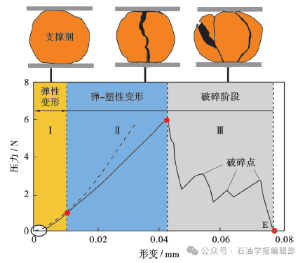 高温高压环境下页岩流变特征行为显著,裂缝壁面与支撑剂之间存在长期蠕变、破坏,支撑剂颗粒挤压、压实、嵌入、破碎等非线性非连续多重力学作用行为(图7)[52-53]。支撑剂颗粒与页岩非线性力学作用下的水力裂缝支撑宽度不足,支撑剂运移铺置困难,支撑剂颗粒在深层页岩复杂缝网中的空间展布不均匀,有效支撑受到抑制。闭合应力高,支撑剂嵌入和破碎对缝网长期导流影响严重[54],导流渐变规律不清。