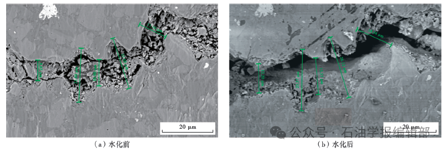 页岩水化实验表明[44-45],页岩水化后抗拉强度降低,矿物颗粒间黏聚力减弱,矿物溶蚀、脱落,扩大溶蚀孔缝和产生新的微细裂缝(图4),增加应力弱点或弱面,有可能增加裂缝起裂点和扩展路径,从而提升缝网复杂程度。深层—超深层页岩黏弹塑性变形行为认识不清,不同力学加载下的破裂规律不明。