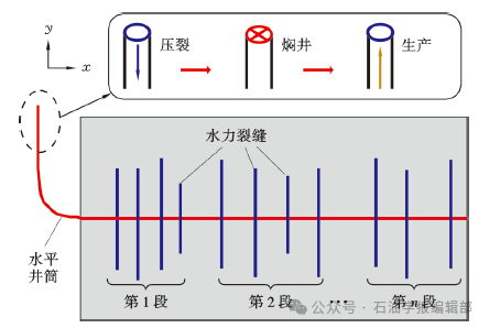 制定最佳焖井时间,制订合理的气井返排生产制度是深层—超深层页岩气井优化配产、提高单井EUR的关键环节。页岩水化促进内部裂缝扩展[135],焖井过程中气藏温度回升联合水化效应,将提升缝网复杂度和页岩流动能力,需要加强页岩水化研究优化焖井时间[136]。建立气水两相返排生产流动模型(图15),结合井筒携液理论,研究压裂液返排和全生命周期生产特征,构建深层—超深层页岩气压后排采技术。