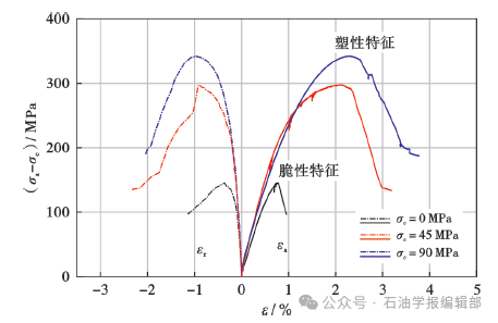 低围压下岩样在峰值点破裂后应力迅速跌落,弹性势能迅速释放,呈脆性特征;高围压下岩样在峰值点破坏后应力跌落较慢,仍有部分弹性势能储存内部,随围压增加逐渐表现出塑性特征(图2)[41-42],缝网形成难度大。深层—超深层页岩破裂还受岩性、温度和内部结构等多重因素影响,破裂模式及弹脆性演进更趋复杂。