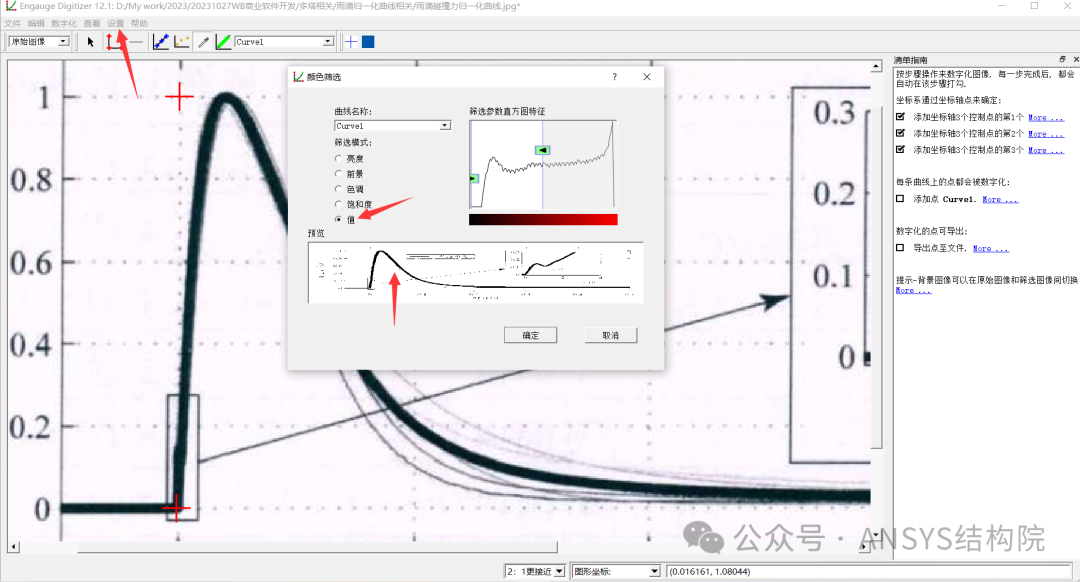 4、坐标系范围确定后,即可点击颜色拾取工具,选择曲线上的一点,如果颜色没能很好的识别,可点击设置--彩色滤光片,调整颜色识别选项。推荐采用值这个选项,不同的设置,有对应的预览。