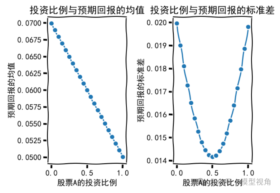 通过调整股票A和B的投资比例 和 ,我们可以进一步探究不同的投资组合配置如何影响预期回报的分布,特别是其均值和标准差,这两个指标对于投资者来说非常重要。