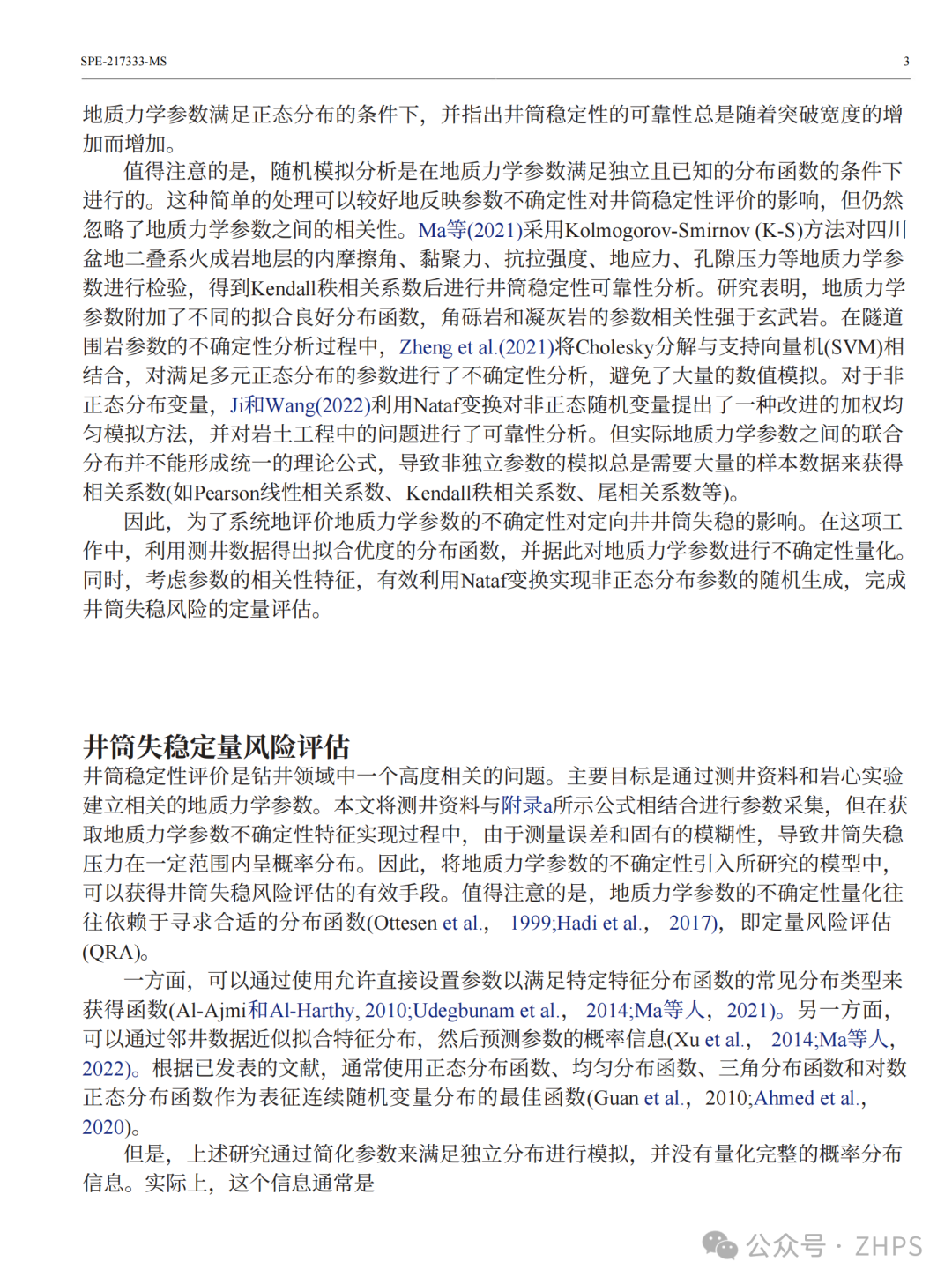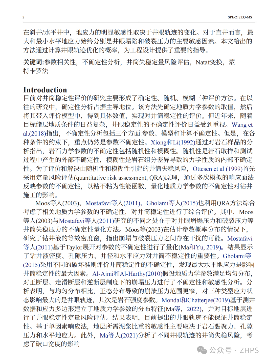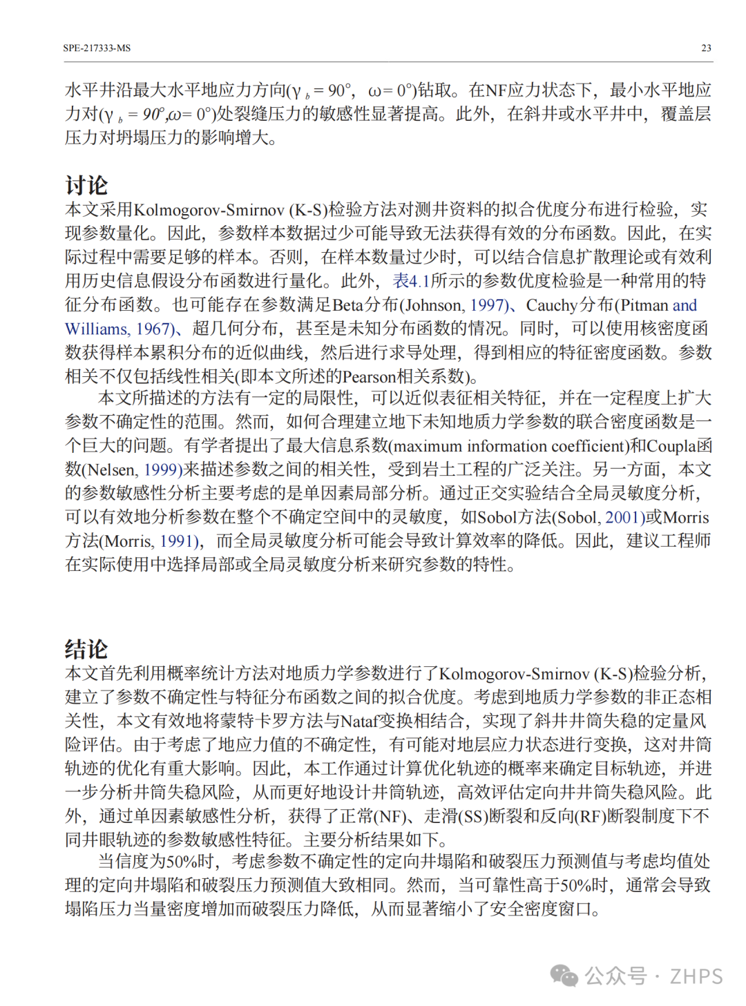 有效分析定向井井筒稳定性风险对复杂深层油气资源勘探具有重要意义。为了钻井过程的顺利进行,井筒稳定性与地层岩石强度特性和井眼周围岩石的应力状态有关,而应力状态又直接受到井眼轨迹倾角和方位角的影响。应力状态取决于地应力的大小。然而,地质力学参数的不确定性和非独立性极大地影响了井筒失稳压力的预测和井筒稳定性评价。因此,本文有效地将蒙特卡罗方法与Nataf变换相结合,对地质力学参数进行采样和模拟,实现井筒失稳定量风险评估(QRA)。在此基础上,研究了不同井眼轨迹和应力状态下井眼坍塌和破裂压力的参数敏感性特征。主要研究表明,基于参数不确定度的井筒失稳风险评估结果表明,当可靠性大于50%时,预测塌陷等效密度通常增大,裂缝压力等效密度减小,导致安全泥浆比重窗口明显变窄。此外,参数不确定性对断裂压力的影响显著大于对坍塌压力的影响。利用相关系数对储层地质力学参数进行约束,保持了参数之间的线性特征,从而显著减小了井筒失稳压力的不确定范围。地应力参数的不确定性使得地层岩石有可能经历由常规走滑断层向正断层转变的应力状态类型。然而,这种应力状态转变的可能性明显影响了井眼轨迹优化的选择。弹性模量、泊松比、黏聚力、内摩擦角、抗拉强度等岩石力学参数对任意倾斜井眼的坍塌压力和破裂压力影响较弱。而在斜井/水平井中,地应力对井眼轨迹的变化具有明显的敏感性。对于直井而言,最大水平地应力和最小水平地应力分别是井眼塌陷和破裂压力的主要敏感因素。该方法通过计算井眼轨迹优化概率,对工程设计具有重要的指导意义。
