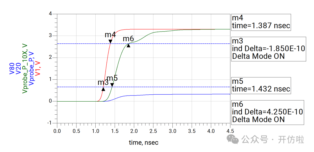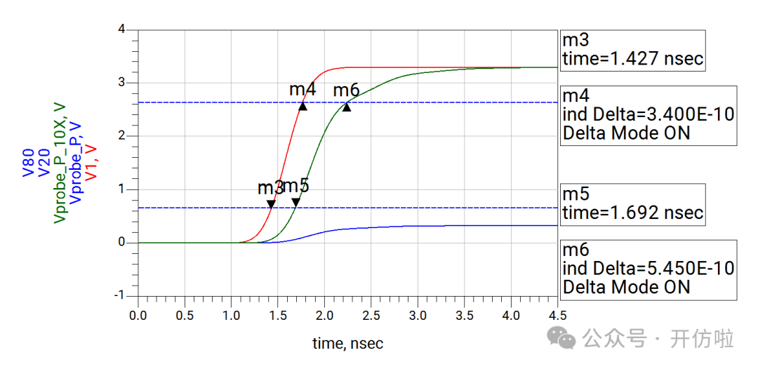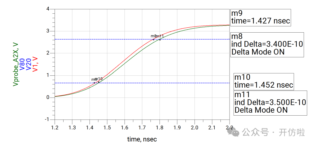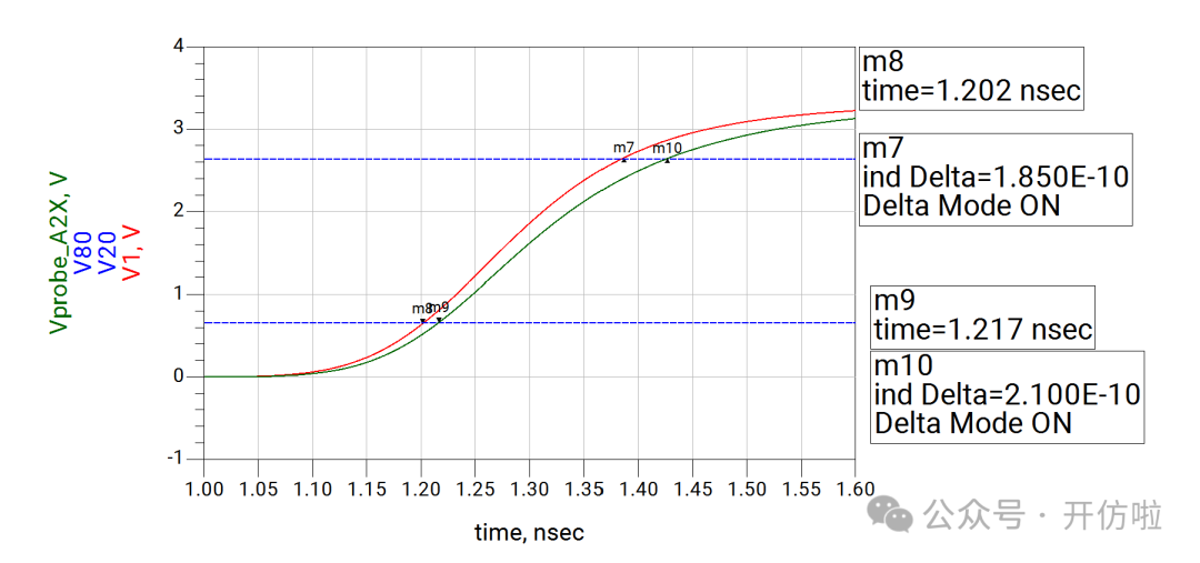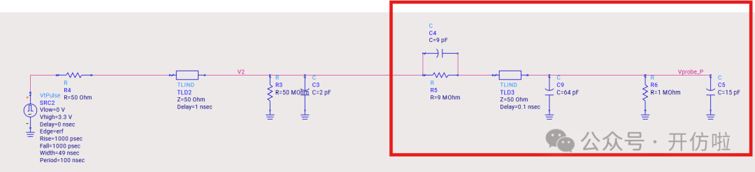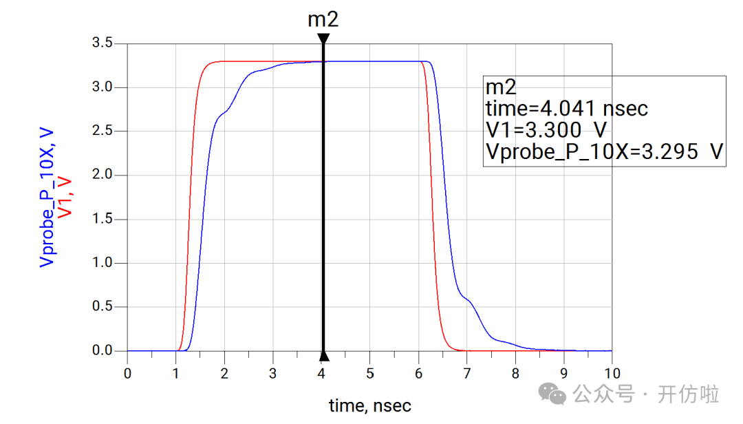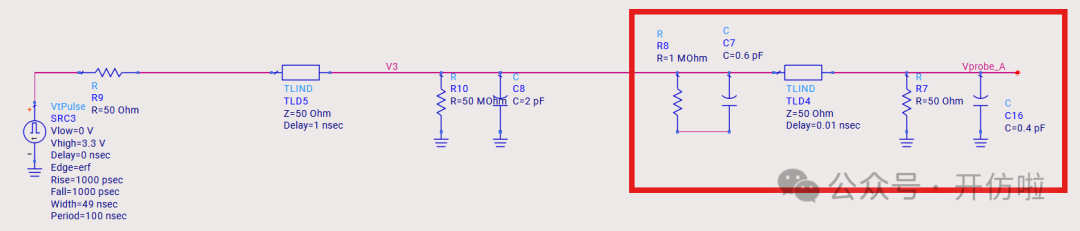 本文我们开么见山,来看一下示波器测试探头对信号的影响。我们用仿真软件来模拟一下在测试10MHz时钟信号和100MHz两种信号时,无源探头和有源探头的测试误差。探头前端是9Mohm的电阻和一个电容,中间是探头线缆和一个补偿电容,最后是示波器内部的输入阻抗1Mohm以及一个输入电容;这样就构成了一个10x的无源探头,从结构中也可以看出,这里并没有阻抗的端接,而且有一些电容的引入,因此有必要考虑其对信号的印象;可以看到,这种10x的探头将电压缩小了10倍,示波器正是用这种方式来探测较大的电压;可以看到波形的边沿变缓了,这正是前文分析的探头电容的影响,10MHz信号大概将信号边沿(20%~80%)变缓了200ps(见下图);100MHz信号大概将信号边沿(20%~80%)变缓了240ps(见下图),而这是不太能接受的。从探头结构中我们可以看到有源探头影响探测结果的主要是等效的并联电容;可以看到,由于示波器选择的是50ohm输入阻抗,因此整个电压被压缩了一半,示波器可以通过放大器进行放大,我们这里就不讨论这个问题了,直接将50ohm电阻dis掉,以观察电容对波形的影响;10MHz信号边沿(20%~80%)变缓了10ps(见下图);100MHz信号边沿(20%~80%)变缓了25ps;可以看到有源探头对信号边沿的影响要小得多,我们直观的对比一下无源探头和有源探头对信号边沿(20%~80%)的影响:因此有源探头更适合高速信号的测量,所以建议几十MHz以上的信号尽量都用对地电容比较低、带宽足够的有源探头进行测试,以减小测试引入的干扰。