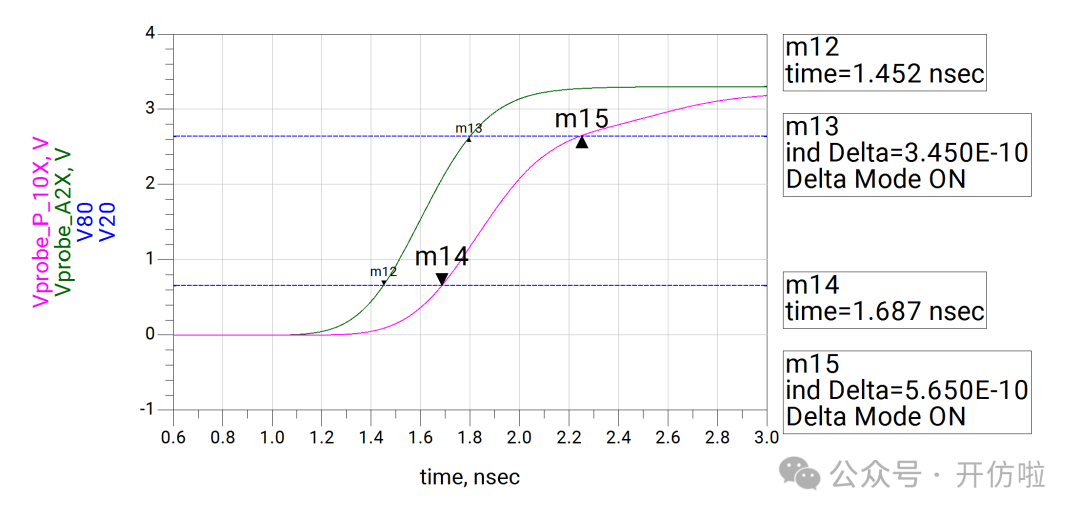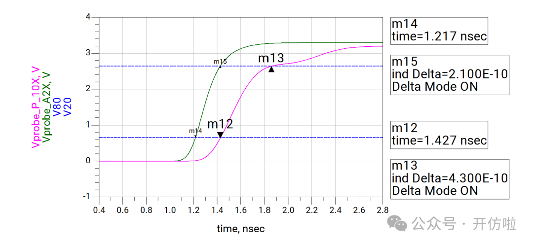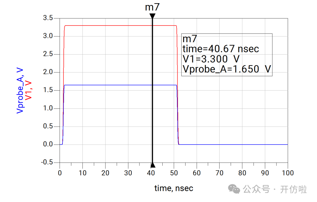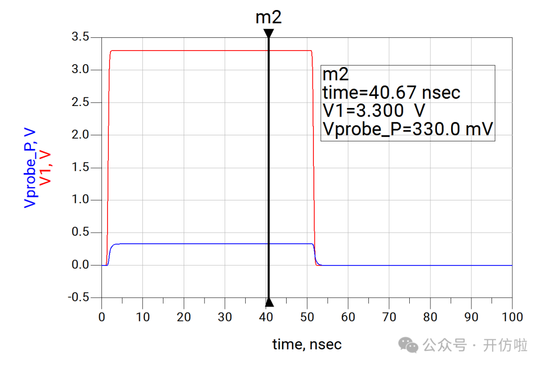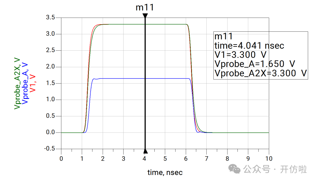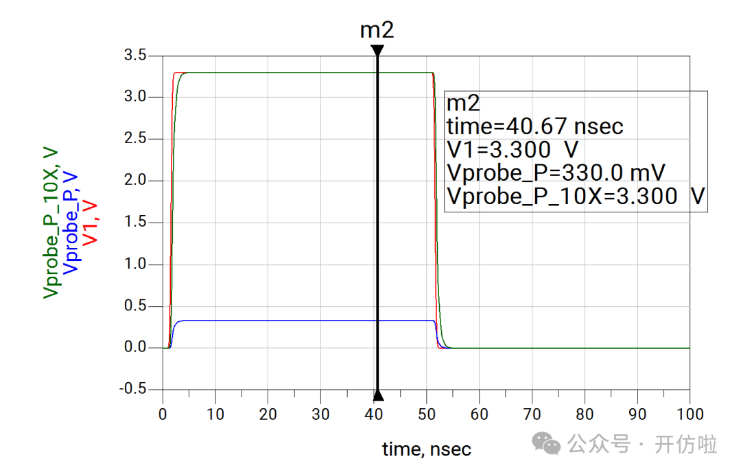 本文我们开么见山,来看一下示波器测试探头对信号的影响。我们用仿真软件来模拟一下在测试10MHz时钟信号和100MHz两种信号时,无源探头和有源探头的测试误差。探头前端是9Mohm的电阻和一个电容,中间是探头线缆和一个补偿电容,最后是示波器内部的输入阻抗1Mohm以及一个输入电容;这样就构成了一个10x的无源探头,从结构中也可以看出,这里并没有阻抗的端接,而且有一些电容的引入,因此有必要考虑其对信号的印象;可以看到,这种10x的探头将电压缩小了10倍,示波器正是用这种方式来探测较大的电压;可以看到波形的边沿变缓了,这正是前文分析的探头电容的影响,10MHz信号大概将信号边沿(20%~80%)变缓了200ps(见下图);100MHz信号大概将信号边沿(20%~80%)变缓了240ps(见下图),而这是不太能接受的。从探头结构中我们可以看到有源探头影响探测结果的主要是等效的并联电容;可以看到,由于示波器选择的是50ohm输入阻抗,因此整个电压被压缩了一半,示波器可以通过放大器进行放大,我们这里就不讨论这个问题了,直接将50ohm电阻dis掉,以观察电容对波形的影响;10MHz信号边沿(20%~80%)变缓了10ps(见下图);100MHz信号边沿(20%~80%)变缓了25ps;可以看到有源探头对信号边沿的影响要小得多,我们直观的对比一下无源探头和有源探头对信号边沿(20%~80%)的影响:因此有源探头更适合高速信号的测量,所以建议几十MHz以上的信号尽量都用对地电容比较低、带宽足够的有源探头进行测试,以减小测试引入的干扰。