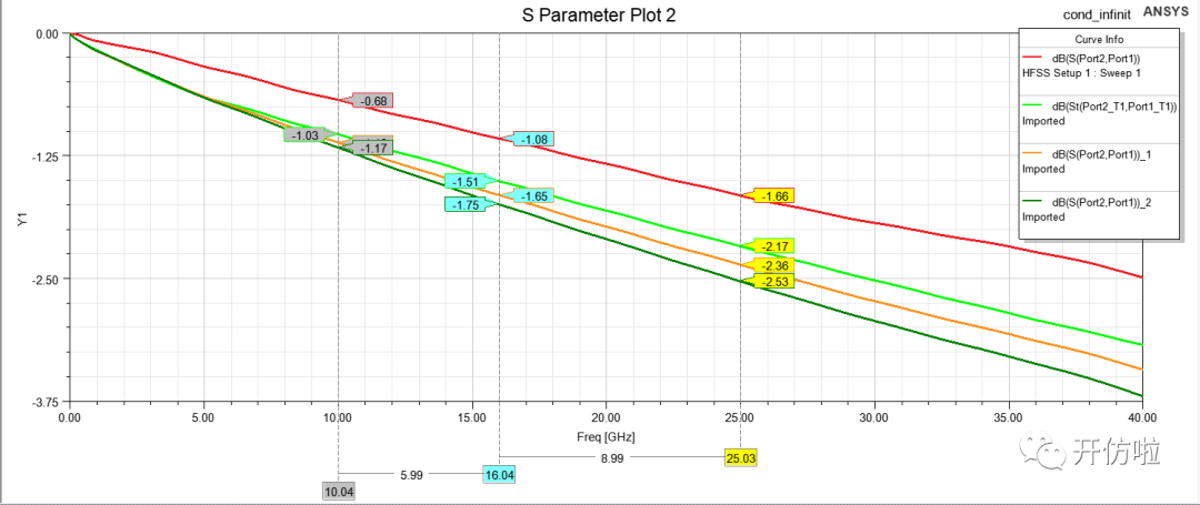 通过仿真对比,可以看见导体损耗进一步变大,不同的模型结果也有所不同,所以在仿真时需要充分考虑导体损耗以及导体表面粗糙度的影响。