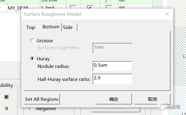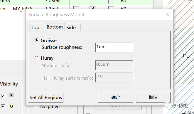 可以看到随着频率升高,趋肤深度越小,频率在25GHz时,铜导体的趋肤深度大约为0.41um,而普通的RTF铜箔的粗糙度Ra大约为3um-5um,因此需要粗糙度更加低的铜箔--HVLP,这种铜箔的粗糙度大概为0.5um左右,可见导体表面粗糙度对导体损耗有很大影响,下面对比3Dlayout中默认的两种导体粗糙度模式Groisse和Huray,设置采用软件默认设置,S参数如下: