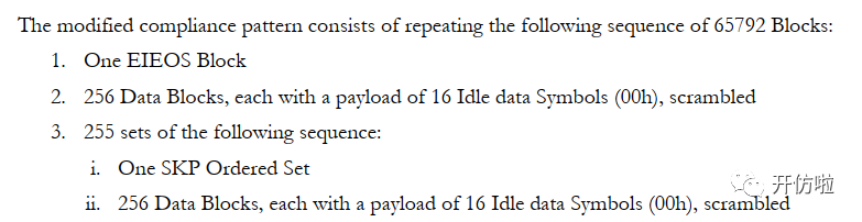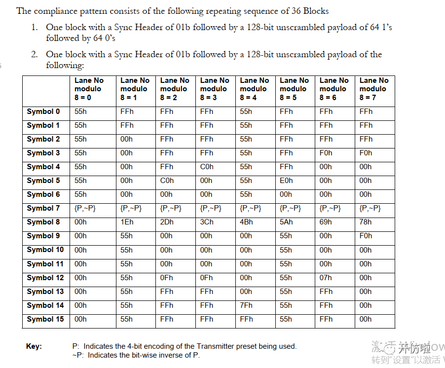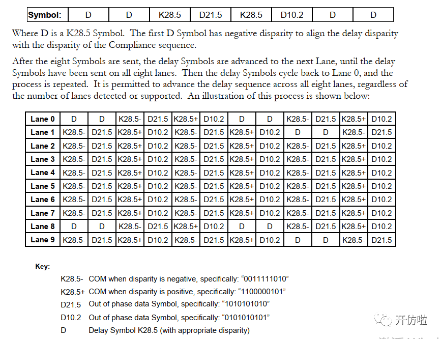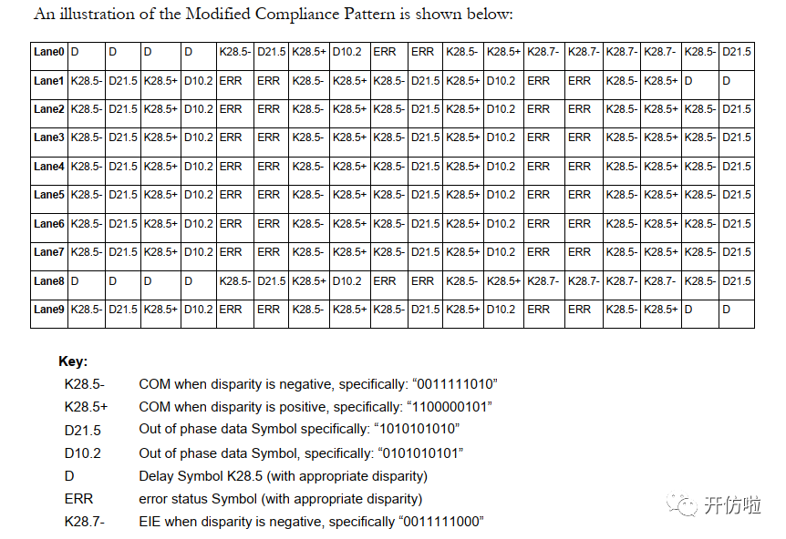 大概意思就是,测试码型为重复的8个symbol,D D K28.5- D21.5 K28.5+ D10.2 D D,D也是K28.5,第一条lane(lane0)的8个symbol发完后将这8个symbol传递到第二条lane上,以此类推一直到第八条lane又回到lane0,如果是X16的,后面的八个和前八个一样,每条lane发送完这8个symbol后,即是重复的K28.5- D21.5 K28.5+ D10.2