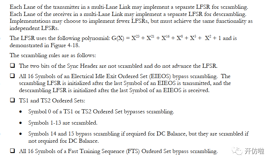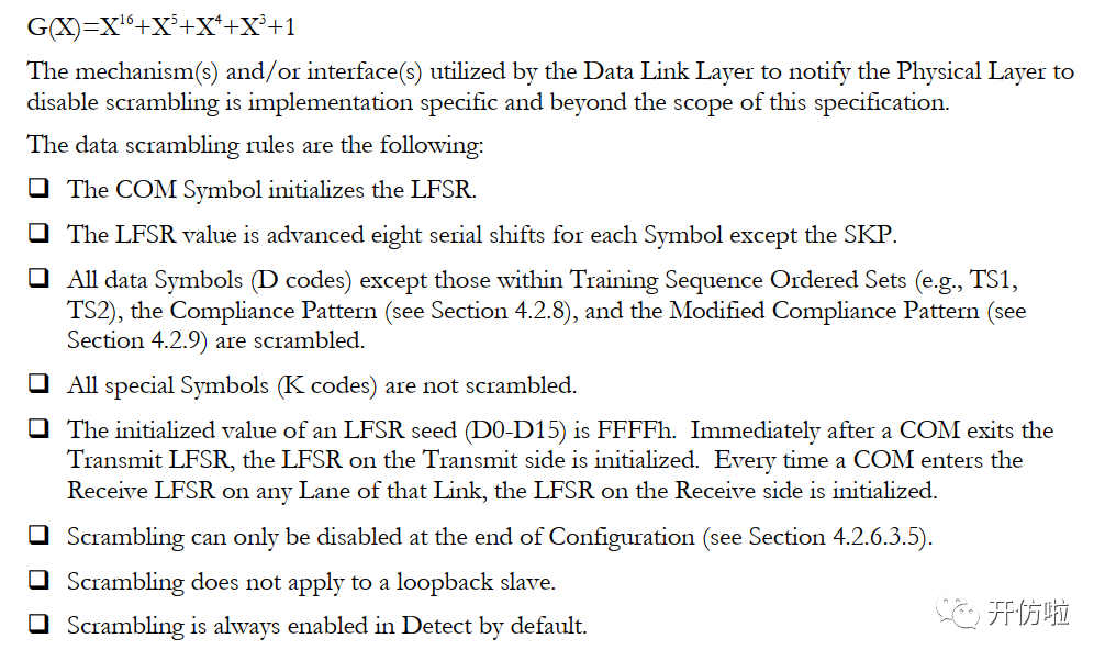 先来看一下,PCIE1.0和PCIE2.0采用8b/10b编码,编码前先进行扰码,扰码器和扰码器的种子(初始值)如下:
