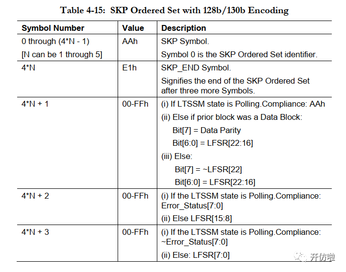 第一部分为一个SKP ordered set,如下图,码型中的symbol应该也是16个,所以N等3,所以symbol0~symbol11为AAh,即10101010,symbol12为E1h,即11100001,symbol13为AAh,即10101010,symbol14为eer_status,没有err为00000000,symbol15也为00000000;