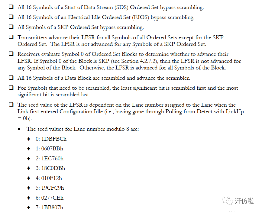 PCIE3.0采用128b/130b编码,编码前先进行扰码,扰码器和种子(初始值)如下: