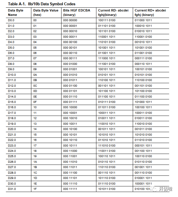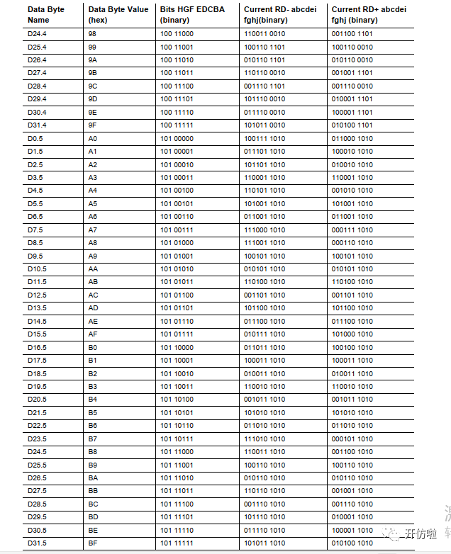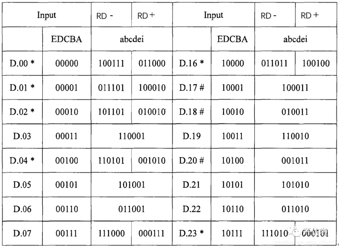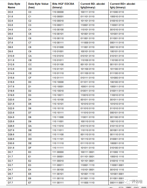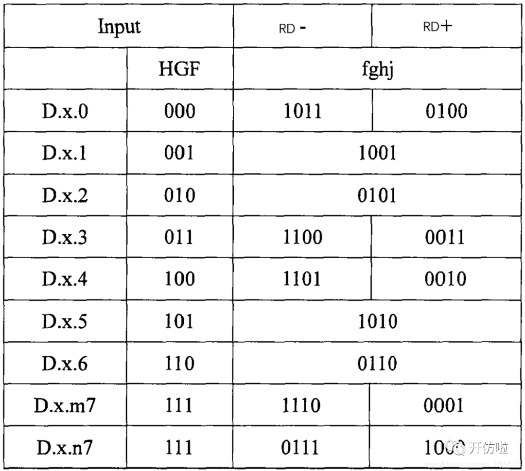 从表中可以看到,有些序列是分RD+和RD-的,如果,0的数量多,则该序列记为RD+,如果1的数量多,则该序列记为RD-,当前一序列为RD+时,下一序列则用RD-,反之亦然,保持直流平衡;