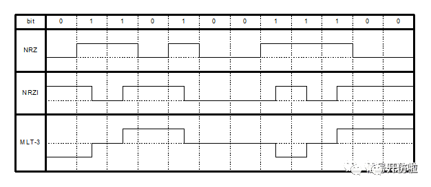MLT-3:multi-level transit-3,多电平传输码,有+1、0、-1三种电平,当序列中发送的是bit1,电平则发生跳变,如果序列中发送的是bit0,则不跳变,跳变时,如果前一个bit是+1或者-1,则下一个bit变为0,如果前一个bit是0,则下一个bit与最近的一个非0bit相反,这种编码由于有三种电平跳变,直流平衡要好于前两种;