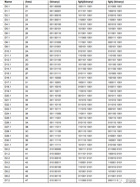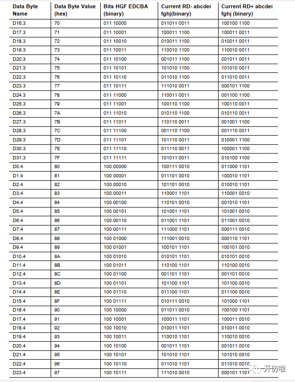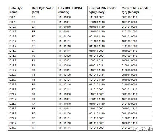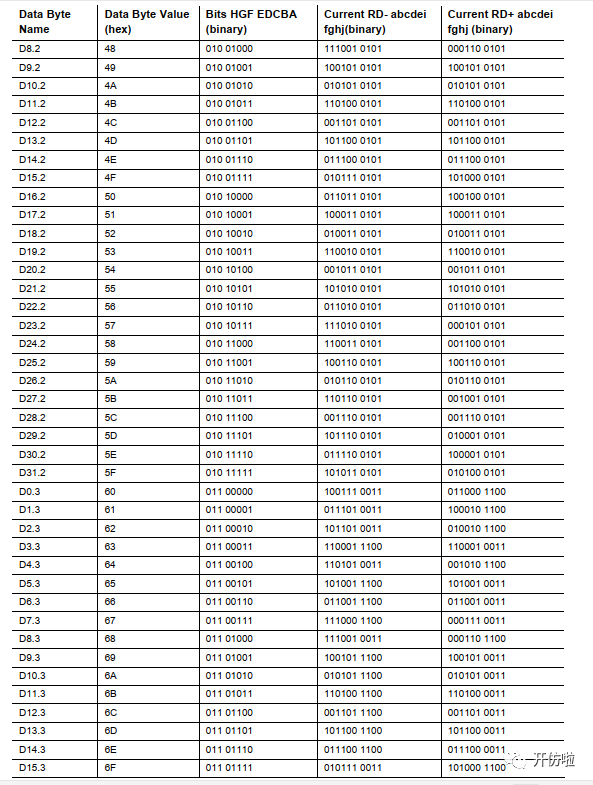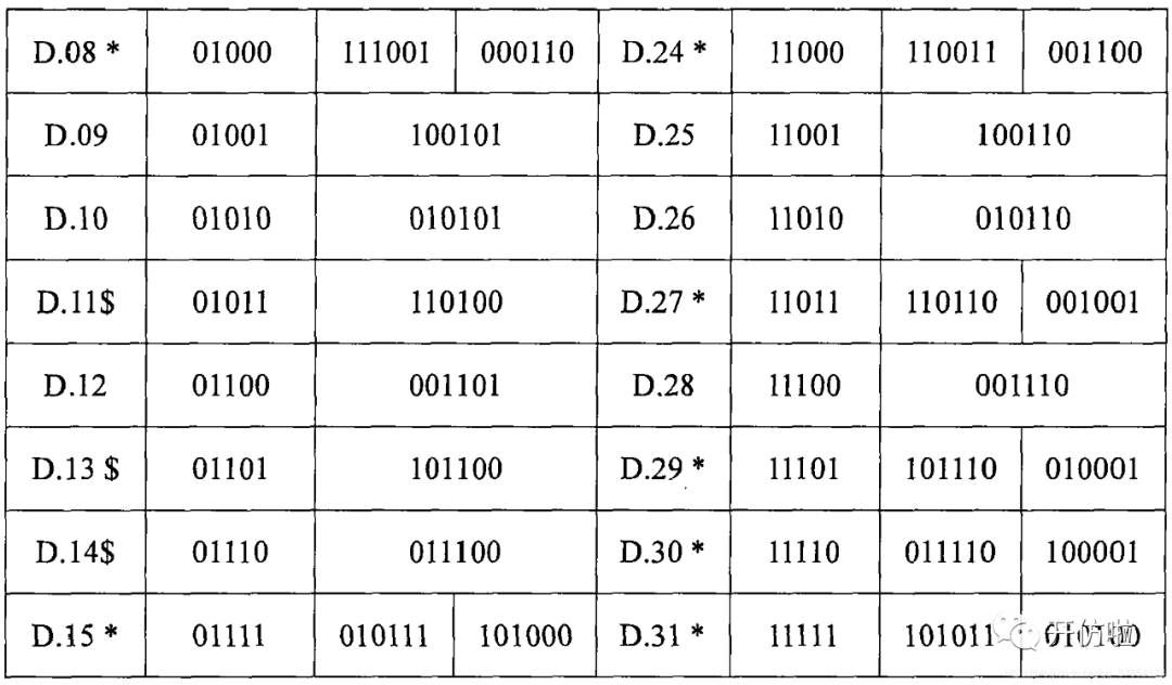 下表是D码的编码表,以及由8bit转为10bit的映射: