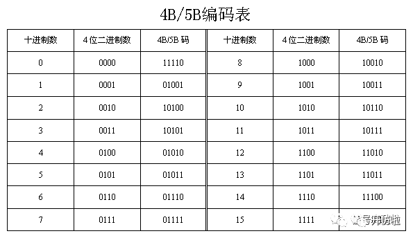 4b/5b:这种编码是将原来4个bit的序列变为5bit,也就是原来一共有2的4次方(16)种可能的数据,现在有2的五次方(32)种,在这32位种选取16个bit0和bit1数量相当的组合,如00111/10110等,与原来的4bit序列一一对应,剩下的可以挑选用作控制,4b/5b映射表如下: