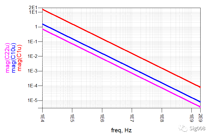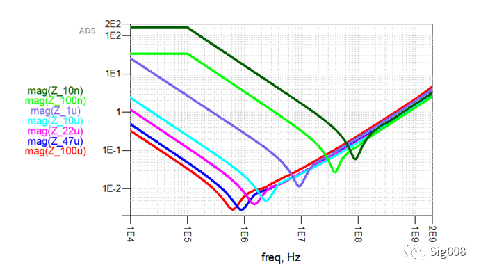 下面再来看一下不同容值电容的阻抗曲线: