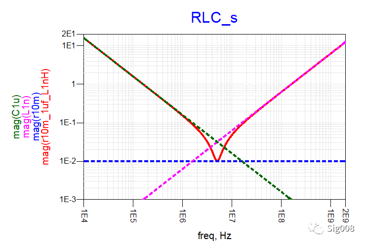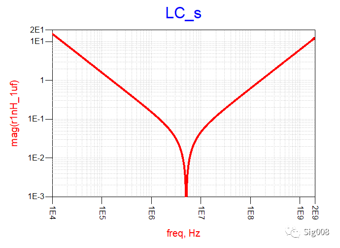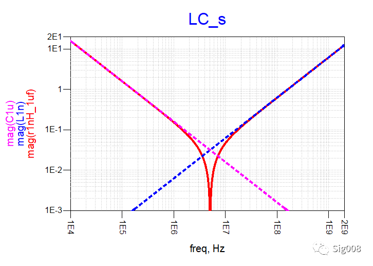 可以看到,RL串联后,低频部分阻抗呈现为阻性,大小为电阻的阻抗大小,高频部分阻抗呈现感性,大小就是串联电感的阻抗大小,下面请看电容和电感串联: