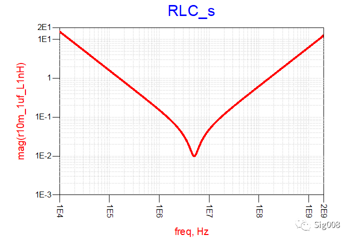 好了,以上这些是基本功,都是为了更好地了解非理想电容的阻抗特性做准备,下面请看真实电容的阻抗特性,即RLC串联(简单模型)