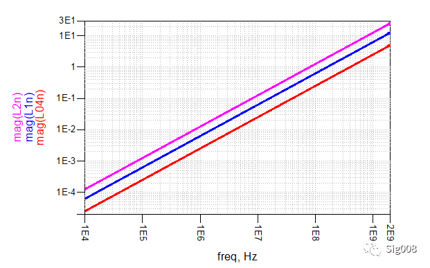 下面看一下,不同电感值的阻抗曲线,相信此时大家已经有了直观的印象,可以脑补出不同电感的曲线了: