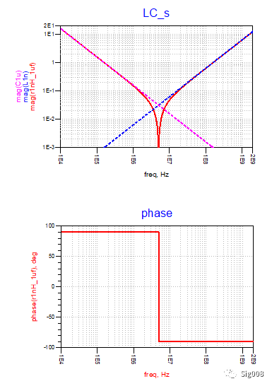 在知道了电容和电感值之后,就可以求出谐振点频率,在此频率之前为容性,在此频率点之后为感性,下图的相位就说明了这一点;