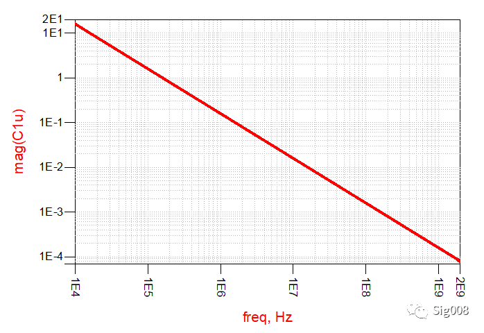 这就是纯电容的阻抗 VS 频率曲线,在曲线中我们可以直观的看出电容阻抗和频率的关系;