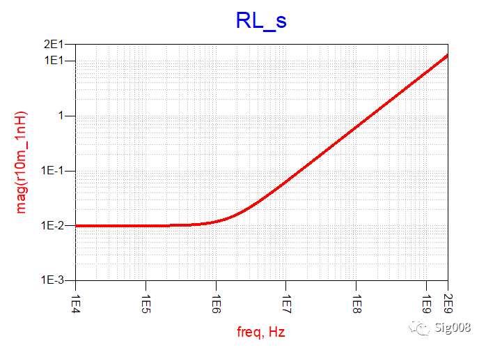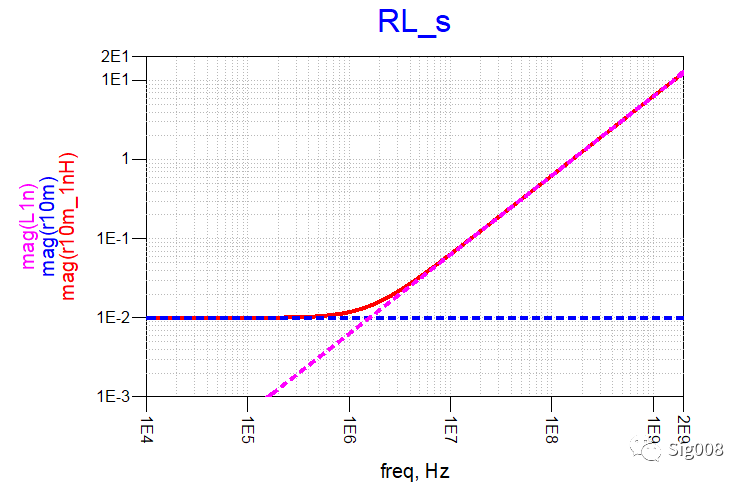 可以看到,RC串联后,低频部分阻抗呈现容性,大小就是串联电容的阻抗大小,高频部分为阻性,大小为电阻的阻抗大小,下面请看电阻和电感串联: