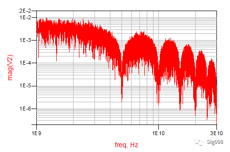 当电容焊盘距离扇出孔间距为600mil时,对应上面的S11曲线中的粉色曲线,此时,在信号基频,2.5GHz及其谐波受到前三个反射峰值的影响,反射在-10dB到-5dB左右,比较大了,因此波形受到了一些影响,波形图如下: