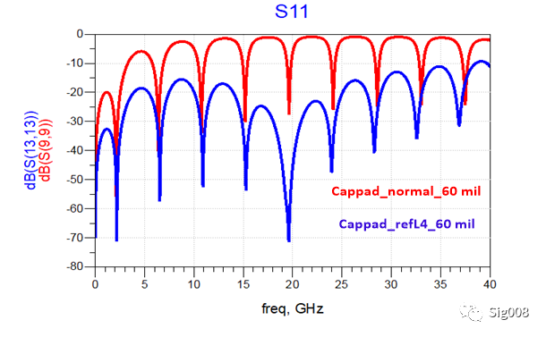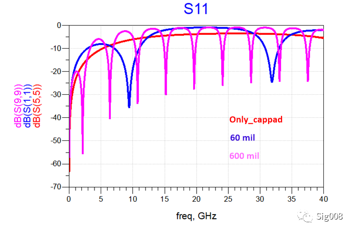 可以看到,红色为仅有电容焊盘时的反射,在与扇出孔级联后会变得更差(蓝色),他们之间的距离越大,S11越差(粉色);