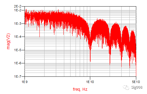 当电容焊盘距离扇出孔间距为600mil时,对应S11曲线中的粉色曲线,此时,在信号基频,12.5GHz及其谐波受到多个反射峰值的影响,基频反射在-2dB左右,非常大了,而25GHz到40GHz这一段频率分量反射则有-1dB左右,非常大,因此波形有比较大的高频噪声,而且波形变形比较厉害,波形图如下: