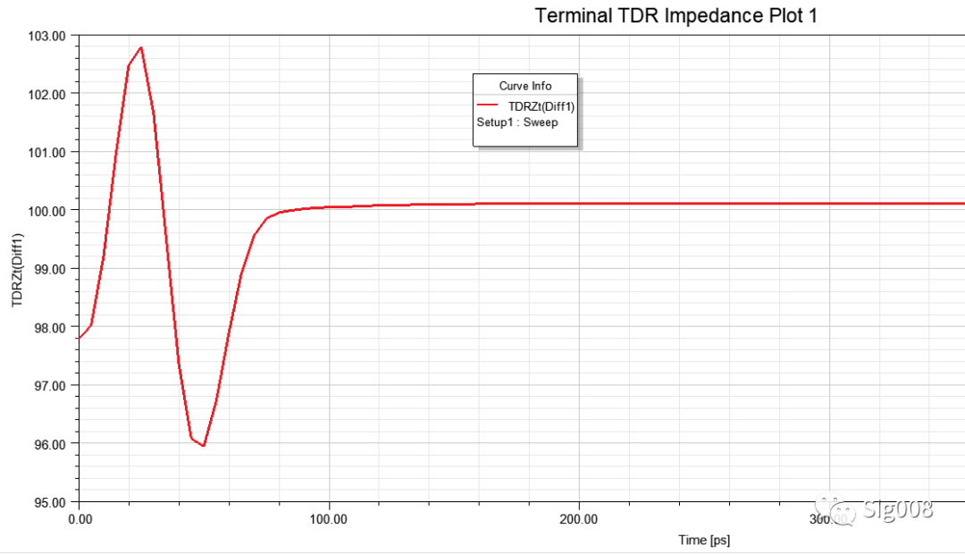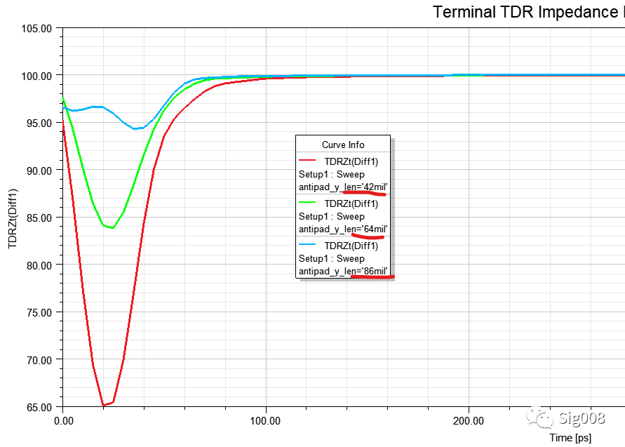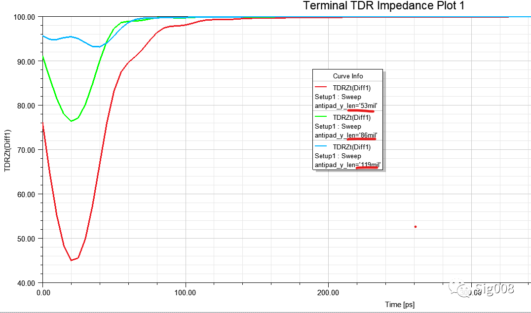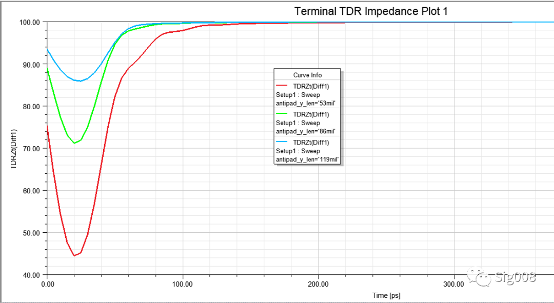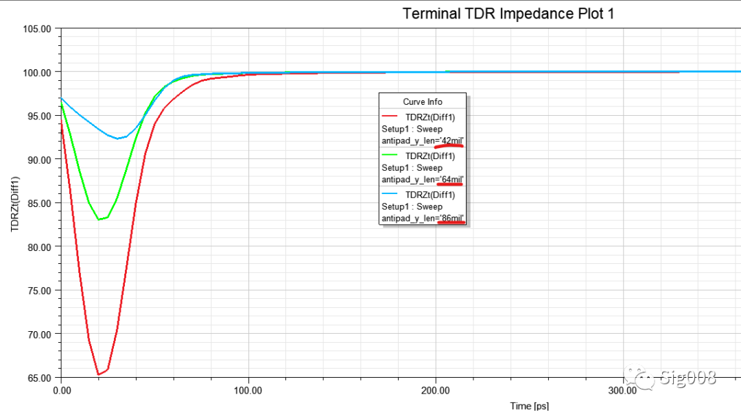 下面看一下,继续将第四层也掏空,此时焊盘参考第六层,10ps时的TDR如下: