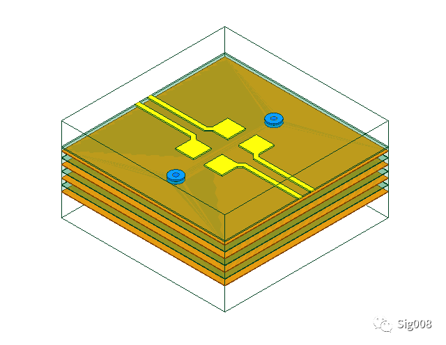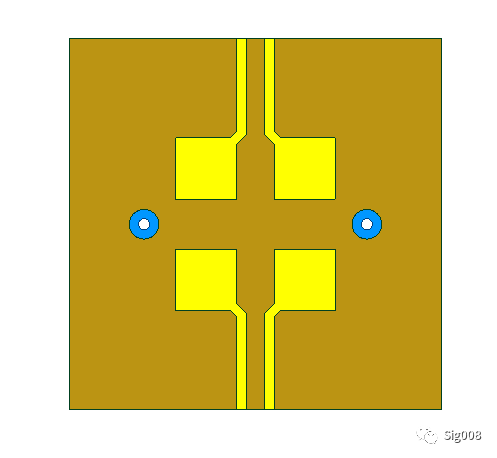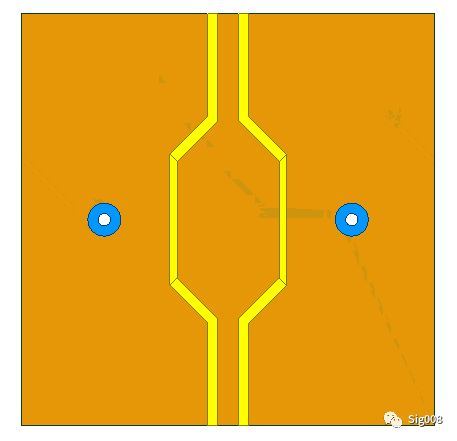对于如下0402封装的电容焊盘结构,传输线在经过焊盘时,由于焊盘尺寸变宽,明显阻抗是不连续的,对如下模型进行仿真。