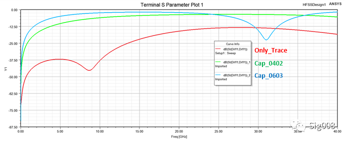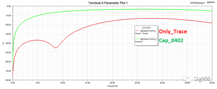 通过TDR可以直观的看到,加上电容焊盘后,阻抗跌落很多,而这也对S11造成了很大影响;