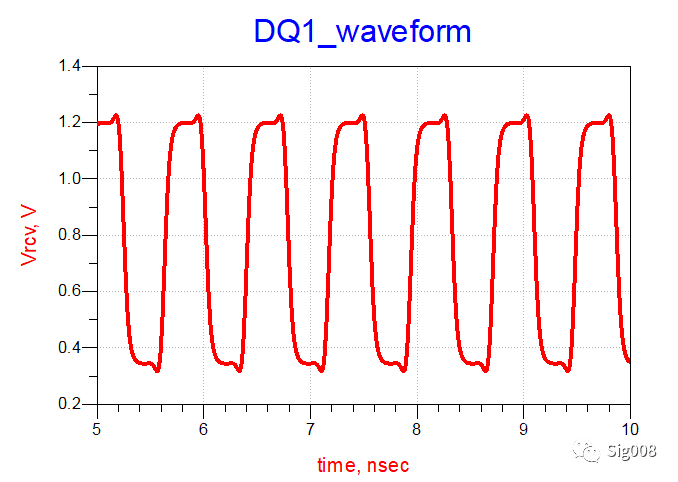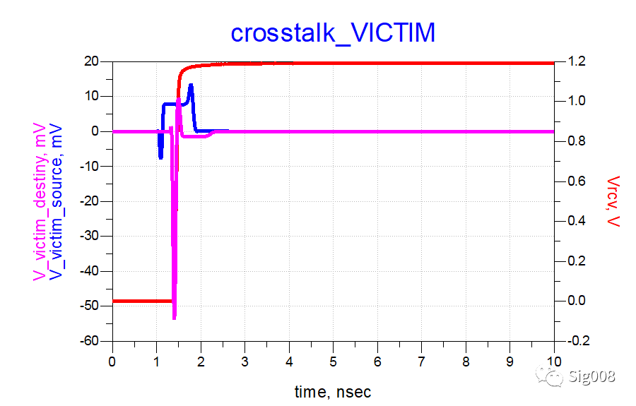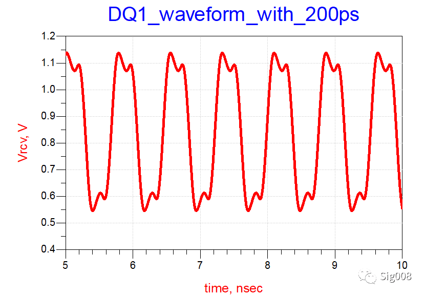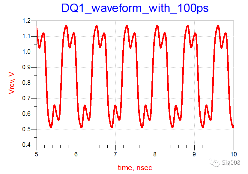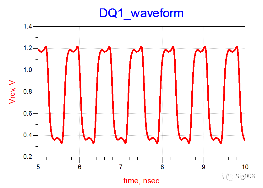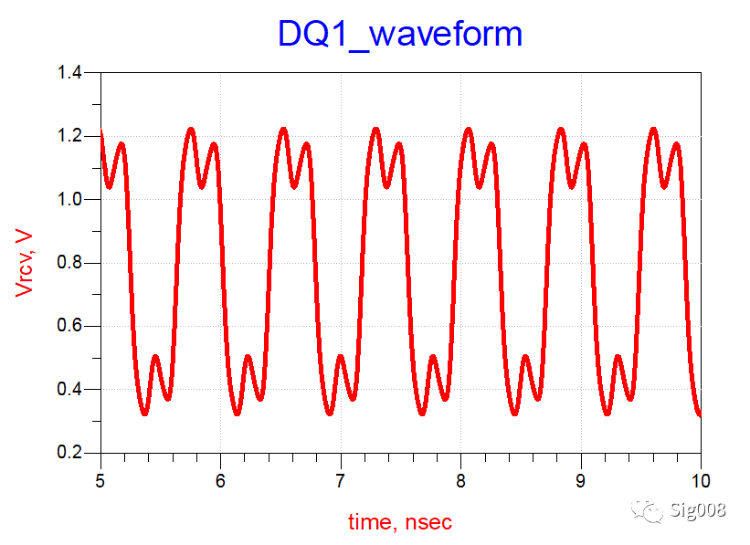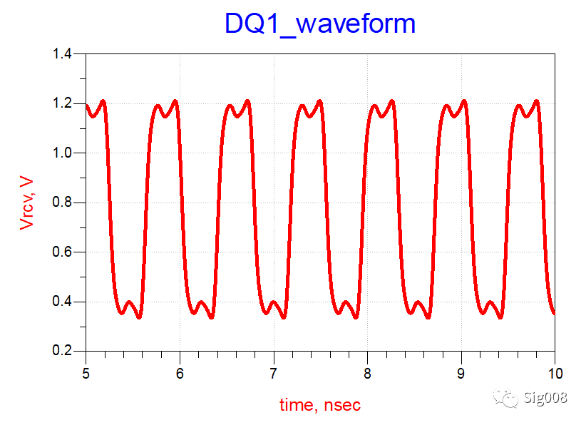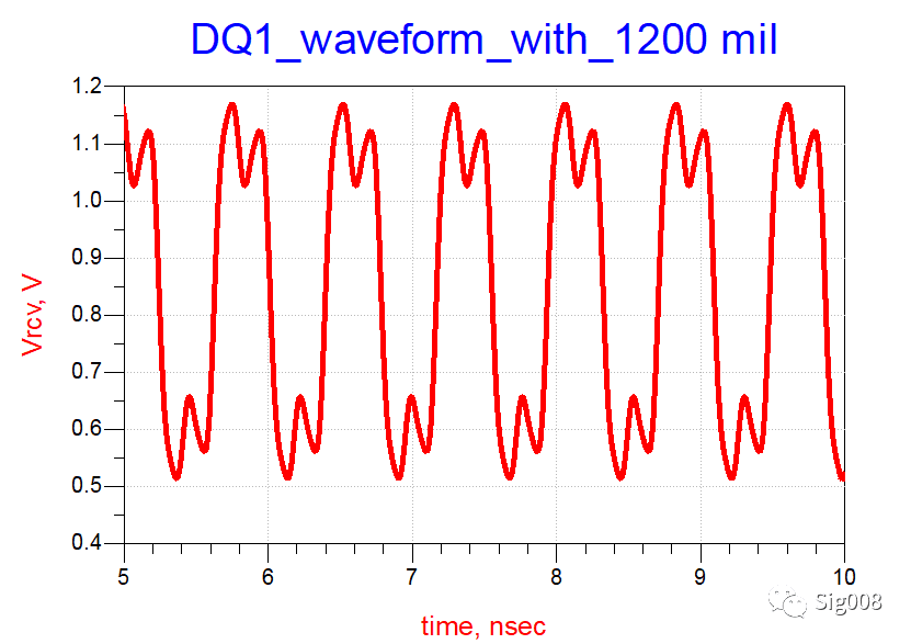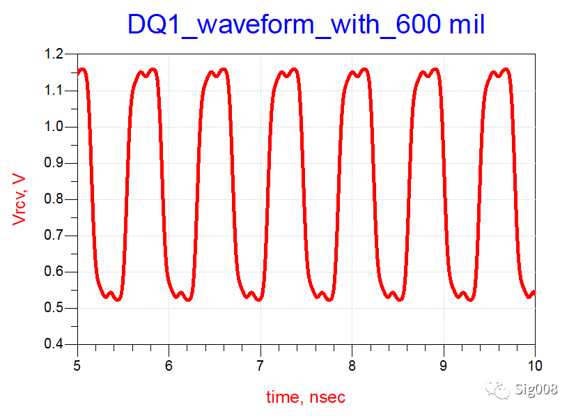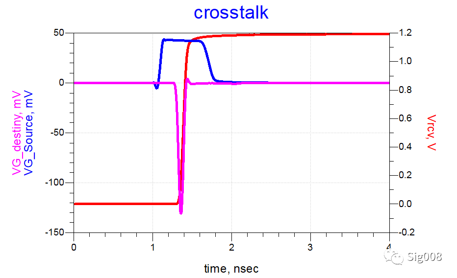 接下来看一下,没有包地线,考虑邻近的信号串扰后波形如下,注意未进行包地处理时,信号线间距为3倍线宽: