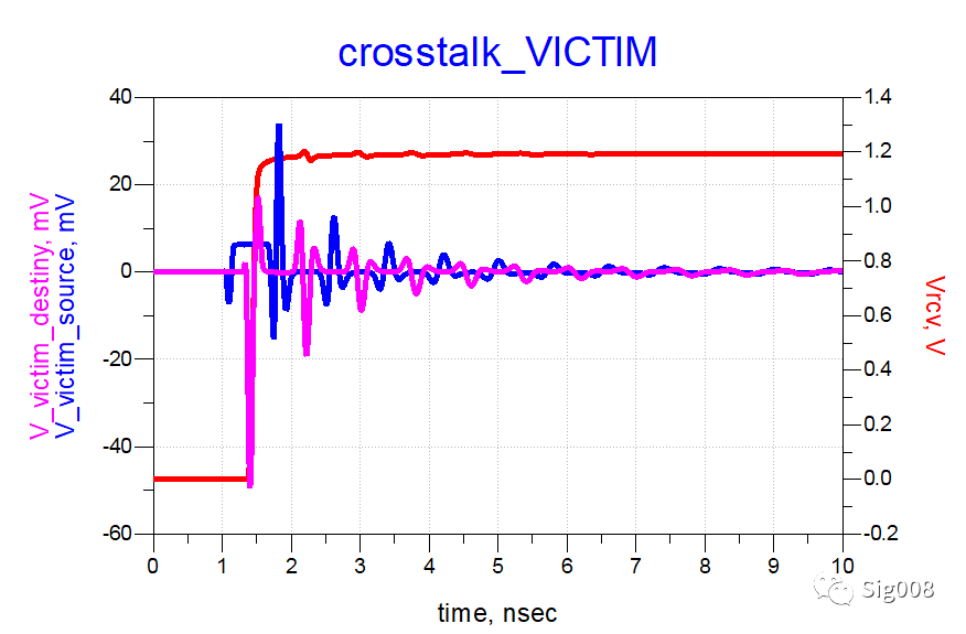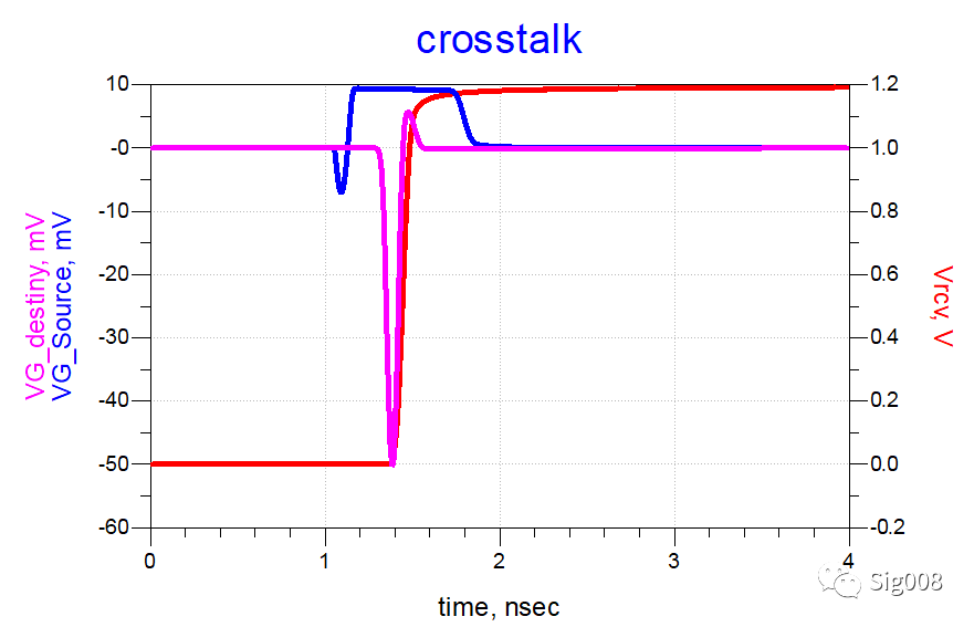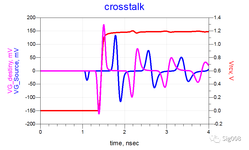 串扰开始震荡,这就是串扰在包地线上来回反射的结果;