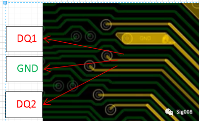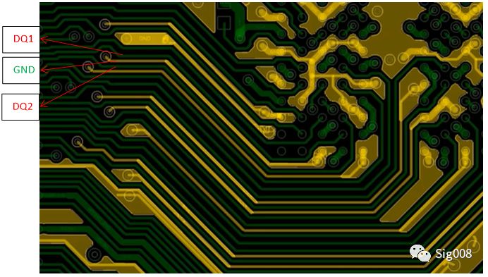 对于如下结构,DDR4的DQ信号之间为了防止彼此串扰,用了包地线;