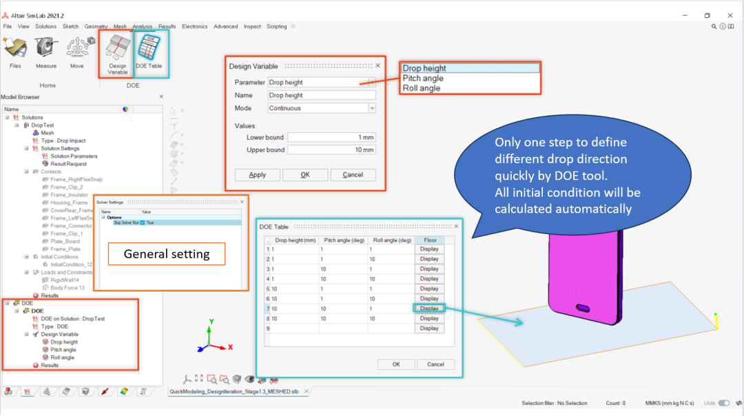 此外,SimLab 还提供了 DOE 工具,可以快速建立多个方向的跌落分析,而不需要反复的导入模型,创建地板等重复性工作。