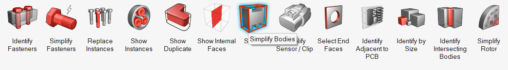 此外,在 Geometry—Body 下,还有很多几何简化小工具,尤其对于电子产品,例如 Simplify Fasteners,用于简化螺栓; Simplify 功能用于简化各种电子元器件;以及 Simplify Sensor/Clip 对传感器和一些连接件进行快速简化。