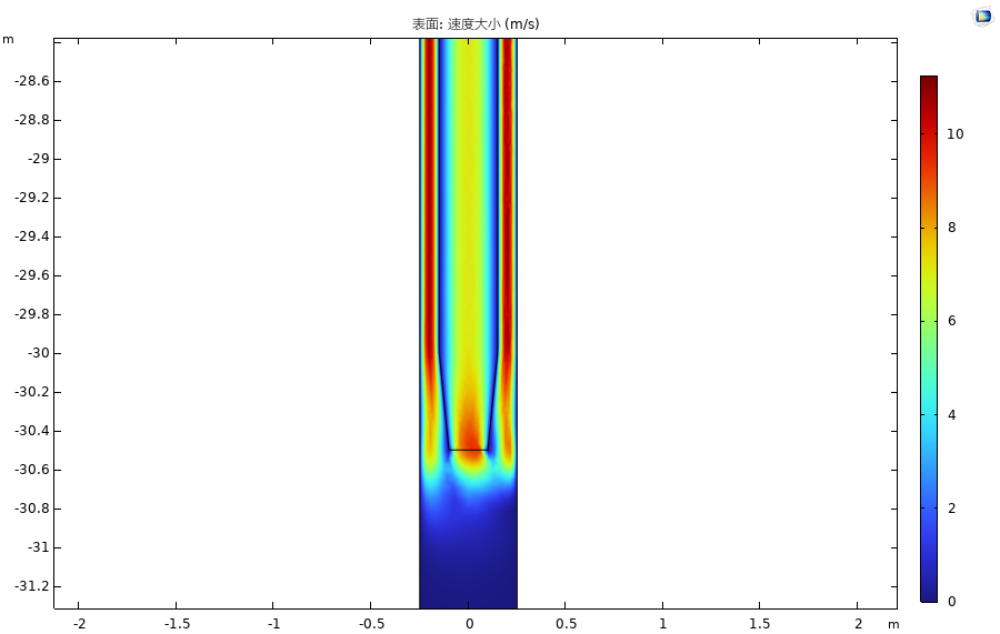 采用稳态全耦合求解器进行求解,通过计算得到泥浆注井过程速度和压力分布如下图所示。