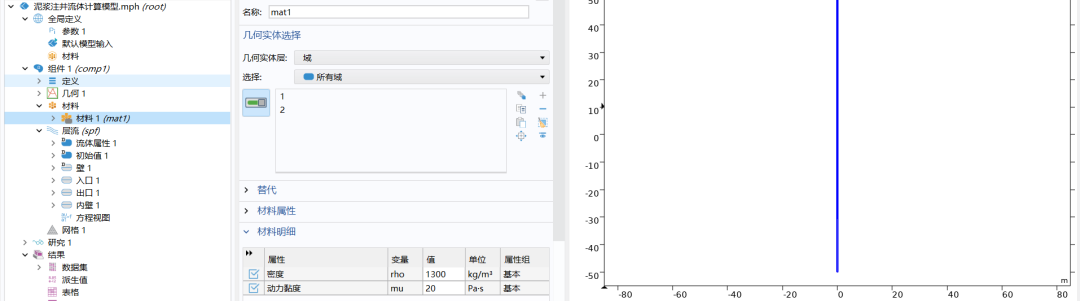 泥浆注井过程中,泥浆在井筒环空及近井地层的流动行为直接决定井筒压力控制、岩屑携带效率与储层保护效果。其流动特性受非牛顿流体流变学影响,传统解析模型难以精确表征瞬态流动规律。基于Comsol构建二维井筒流体模型,重点模拟泥浆在井中的流体运动过程。通过求解纳维-斯托克斯方程,揭示注浆过程流体动力学主控因素,为钻井液参数优化、井筒压力精准调控及抑制储层损害提供科学依据。
