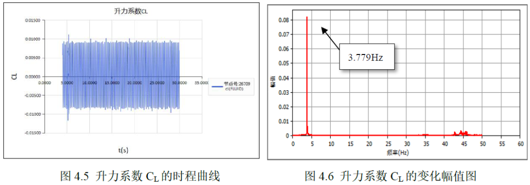 (3)以上结果基本验证了CFD 软件midas NFX 在涡激共振数值模拟计算中的可靠性,图4.5 及4.6 为矩形断面在工况六下的升力系数CL 的时程曲线及经FFT 变换后的变化幅值图。