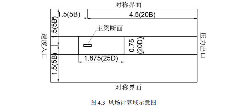 在CAD 软件中,根据文献描述的矩形断面,构建了二维模型,并按照《公路桥梁抗风设计规范》建立了风场计算区域,如图4.3 所示。计算区域被划分为若干区块,其中近壁面区域的宽度为1.875m,高度为0.75 m。在风场计算区域中,距离矩形断面中心左侧的速度入口为5B(即1.5m),右侧的压力出口距离中心为20B(即6 m),上下对称边界距离中心各为5B(即1.5 m)。整个风场计算区域的总宽度为7.5m,总高度为3 m,总面积为22.5 m2。根据阻塞度公式(3-11),在二维平面内,建筑物的最大迎风面积转化为矩形断面的高度,同理,计算域横截面积转化为该风场计算区域的高度。经计算,该风场计算区域的阻塞度为2.5%,符合《公路桥梁抗风设计规范》中规定的计算域阻塞度不得低于3%的要求。最后,将CAD 二维线框文件保存为DXF 格式,并导